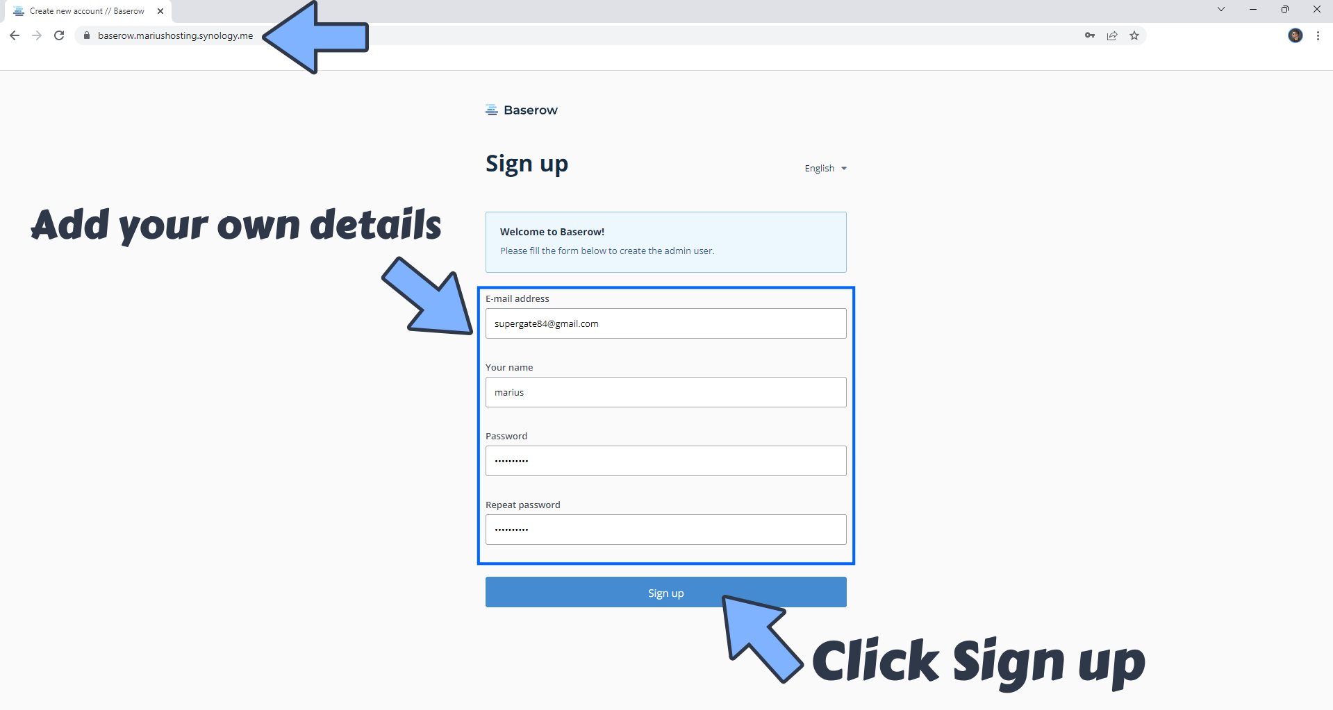 Please wait approximately 10 minutes or you will get a blank synology error page if you try to connect too soon. Now open your browser and type in https://baserow.yourname.synology.meĀ In my case https://baserow.mariushosting.synology.me If everything goes right, you will see the Baserow Sign up page. Add your own credentials Email, Name and Password, then click the Sign up button. Follow the instructions in the image below.
