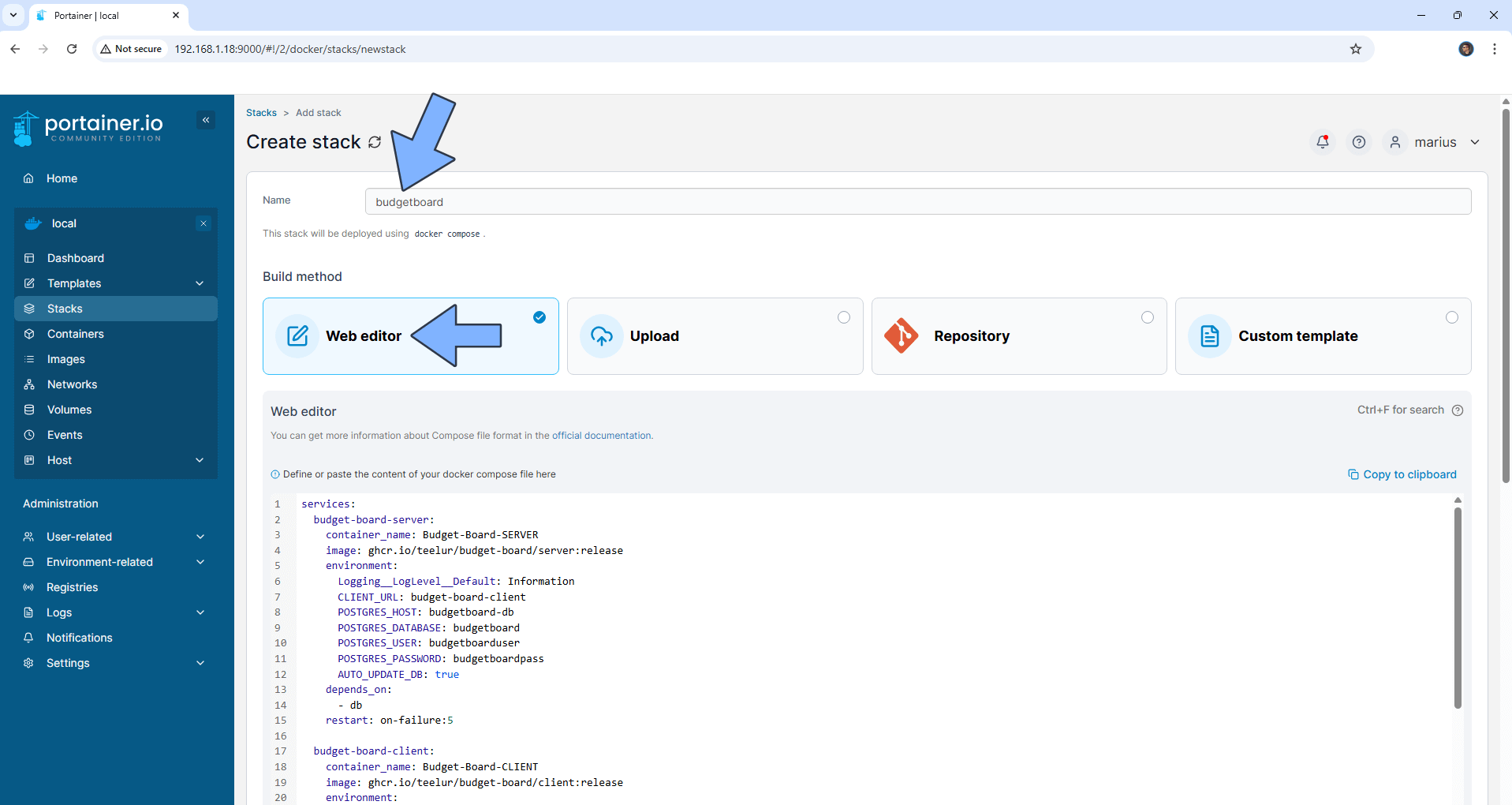 On the left sidebar in Portainer, click on StacksĀ thenĀ + Add stack. Follow the instructions in the image below.