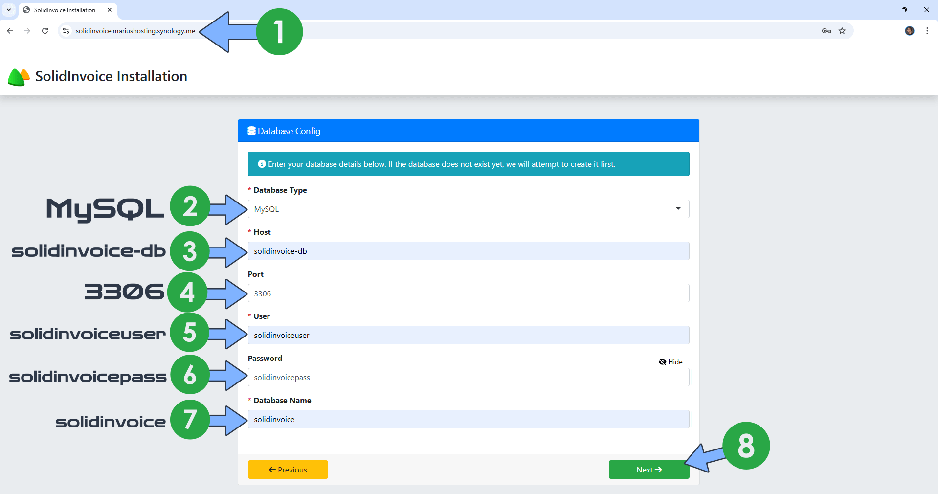 Now open your browser and type in your HTTPS/SSL certificate like this https://solidinvoice.yourname.synology.me In my case it’s https://solidinvoice.mariushosting.synology.me If everything goes right, you will see the Solidinvoice setup page. Follow the instructions in the image below.