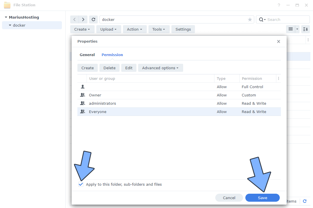 Go to File Station and open the docker folder. Inside the docker folder, create one new folder and name it solidtime. Follow the instructions in the image below.