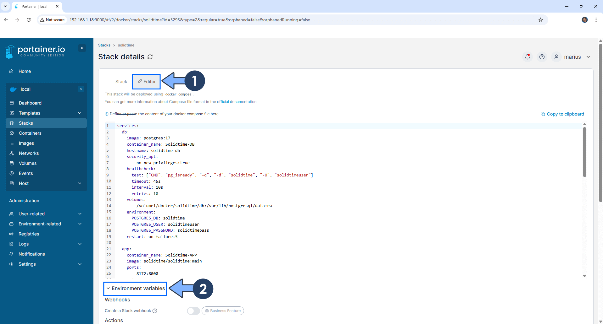 On the left Sidebar in Portainer, click Stacks then solidtime. Follow the instructions in the image below.