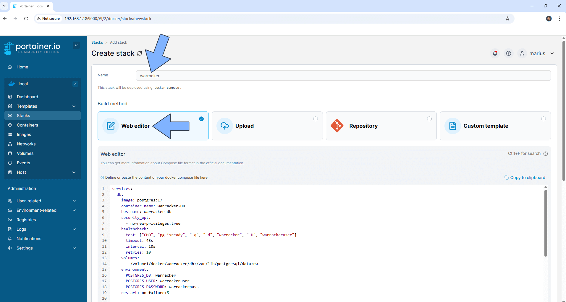 On the left sidebar in Portainer, click on Stacks then + Add stack. Follow the instructions in the image below.